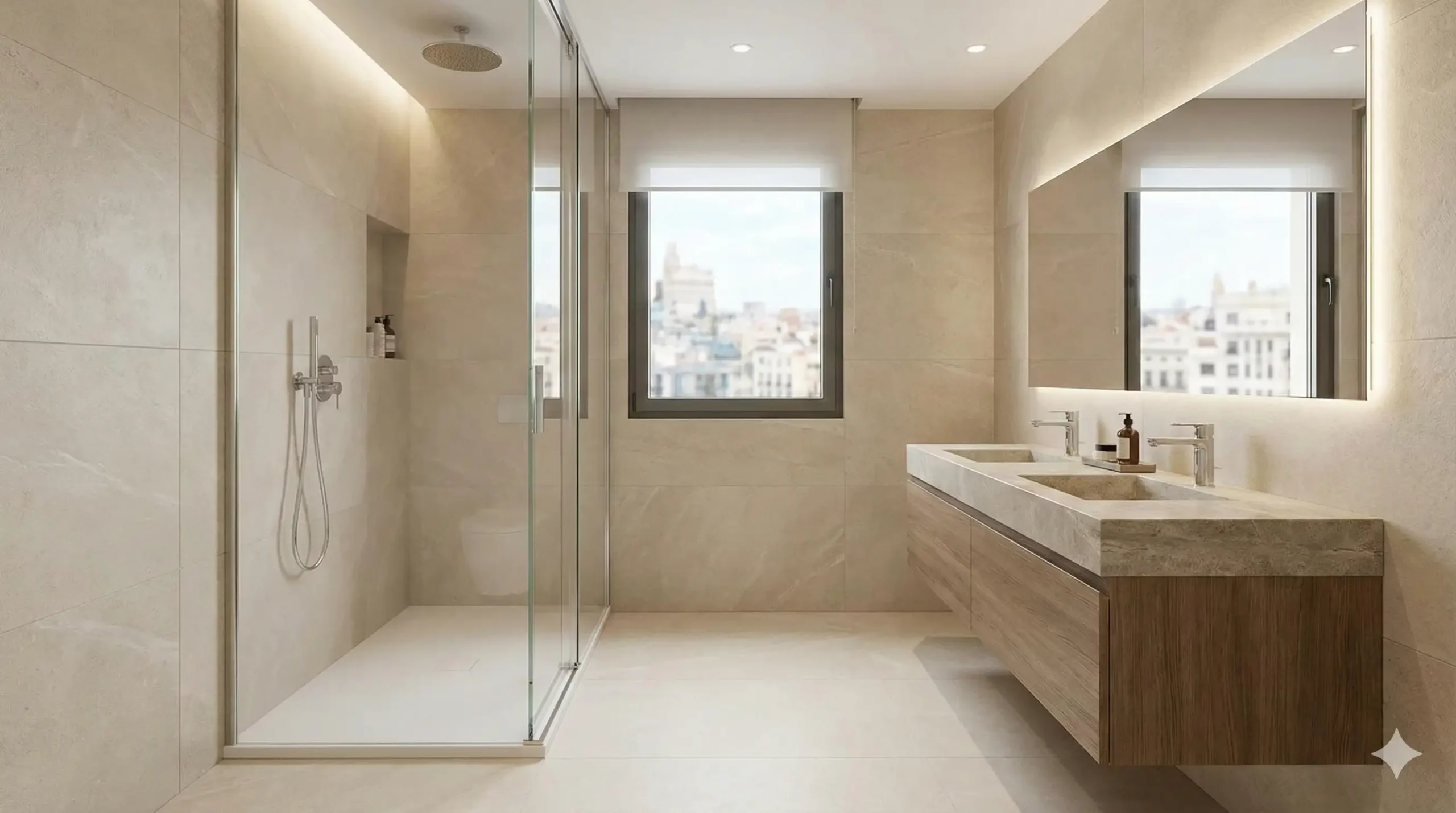 El baño es el espacio más técnico de la casa. Aprovechamos nuestra experiencia en impermeabilización y estructuras para garantizar un resultado libre de humedades y visualmente amplio, incluso en aseos pequeños.